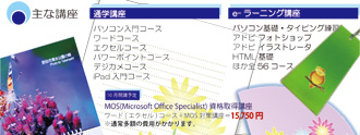 昼間職業訓練を実施している当校が、「教室の空き時間帯」と「最新の機器を備えた施設」を「市民の皆様」に解放し、お気軽に、しかも廉価で、ご利用いただく為に、独自のカリキュラムを組んで指導に当たる「あなたのためのパソコン教室」です。IT関連教育で多くのスペシャリストを輩出してきた実績ある「社会人教育研修センター」(職業訓練校)がパソコン公開講座を開催いたします。